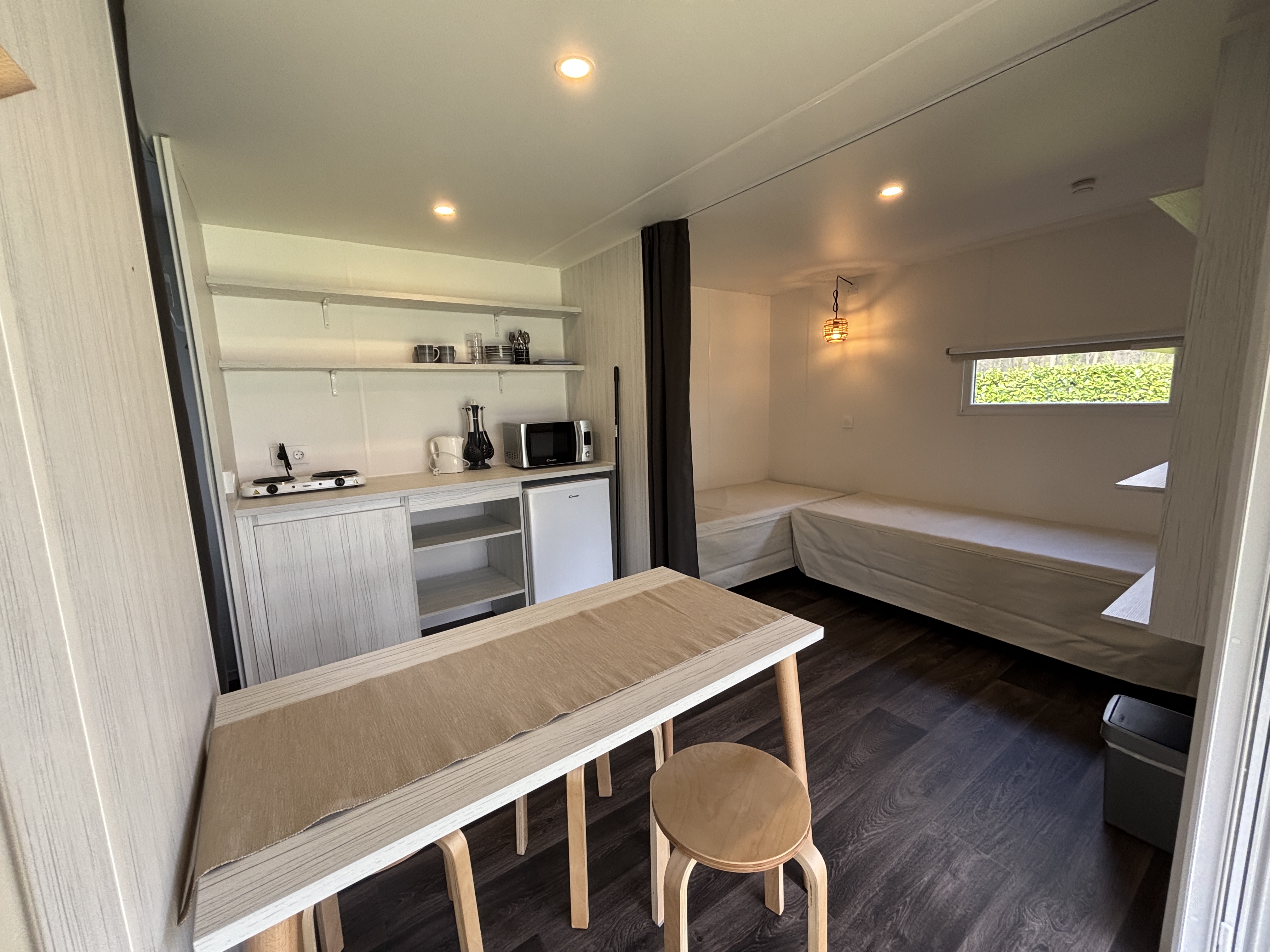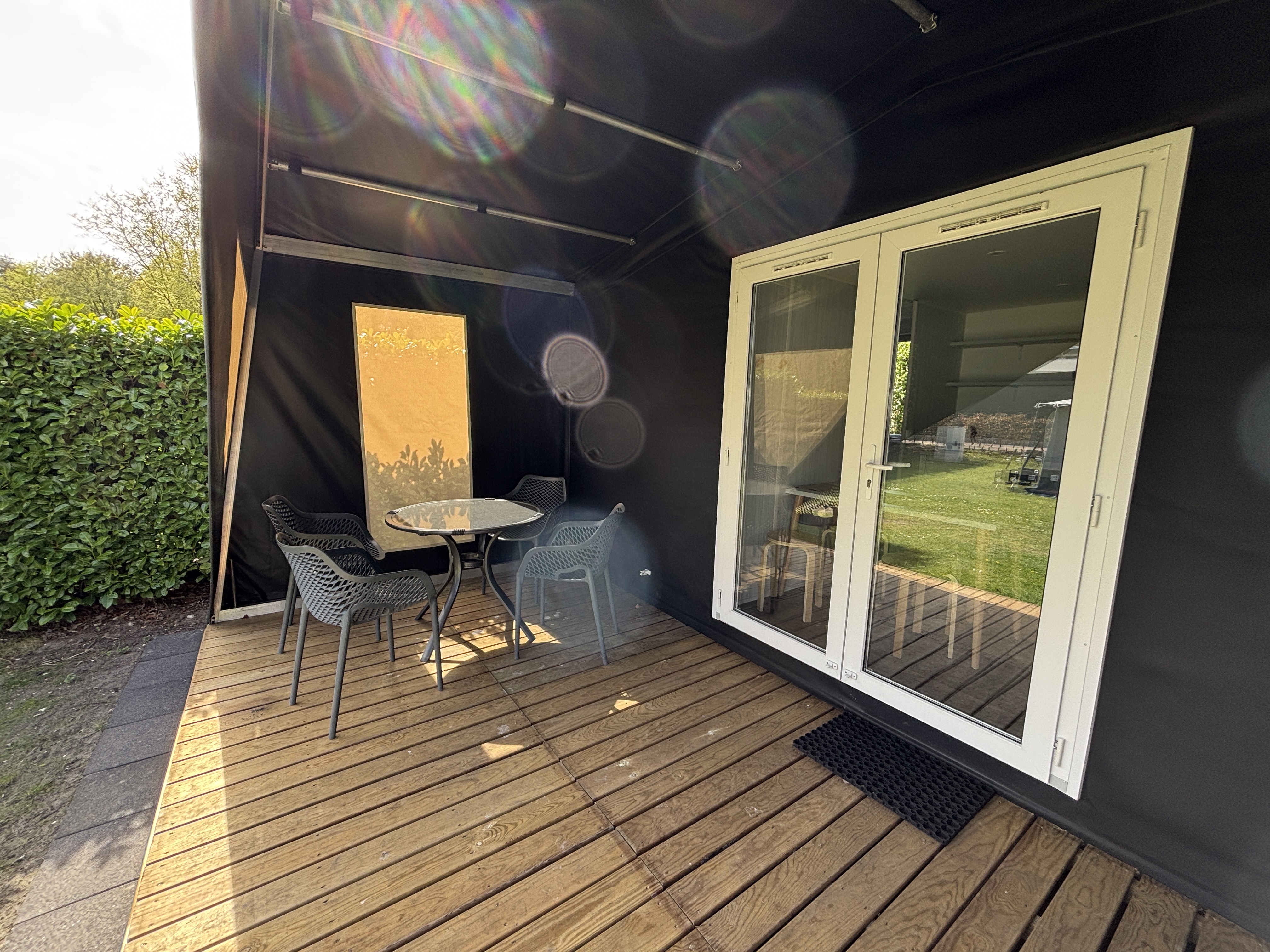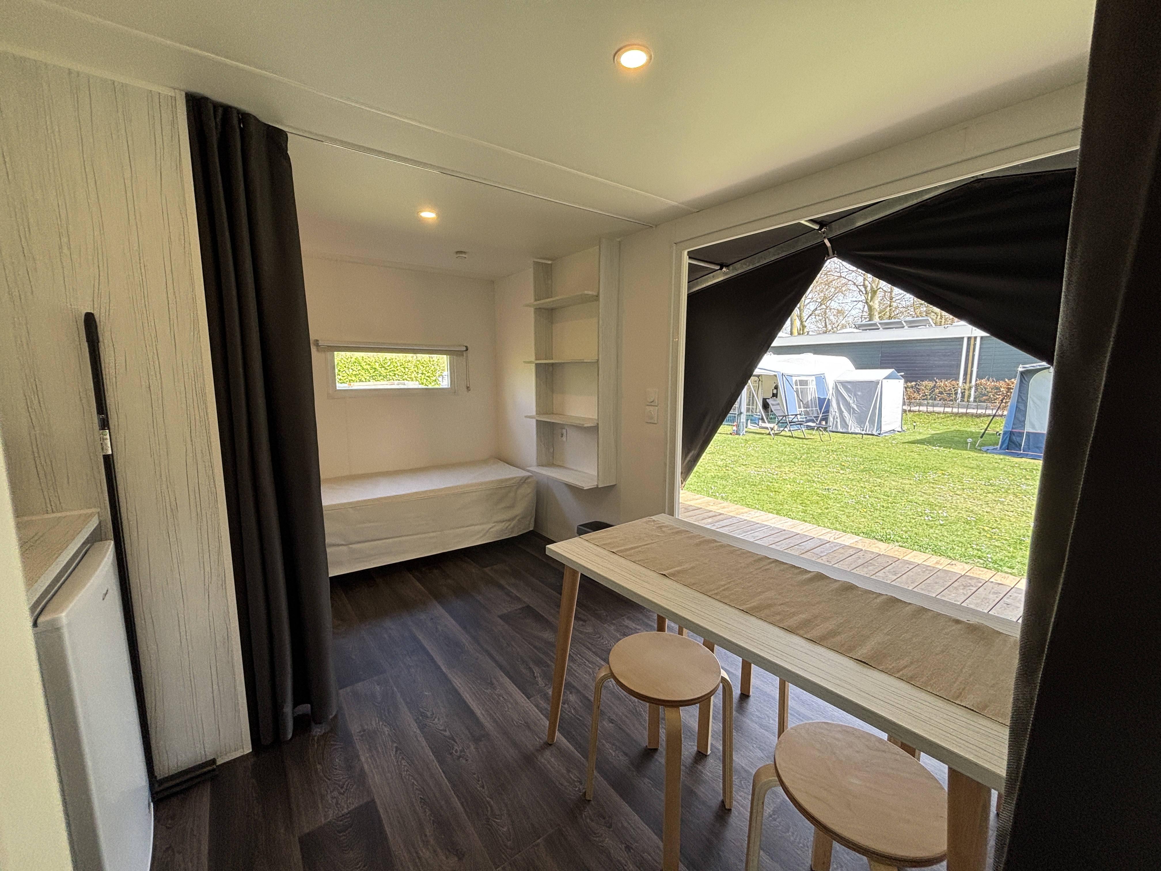 De accommodatie is standaard ingericht voor vier personen en voorzien van elektra, een elektrisch kookplaatje, koelkast, magnetron en waterkoker. Buiten staat meubilair klaar zodat je ook buiten comfortabel kunt zitten. Het watertappunt bevindt zich op het veld en het centrale toiletgebouw ligt op ongeveer 50 meter afstand. Kussens zijn aanwezig, eigen beddengoed dien je zelf mee te nemen. Linnengoed is niet te huur. Honden zijn in deze accommodatie niet toegestaan. De prijs is inclusief schoonmaakkosten, milieuheffing en boekingskosten; toeristenbelasting wordt apart berekend per persoon per nacht.